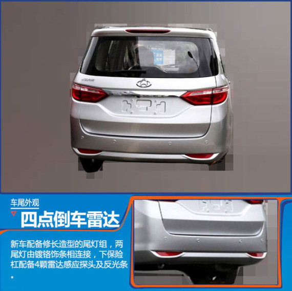新车尾部设计采用流畅平直线条,尾灯采用了较为修长的造型,左右两侧尾灯由一条镀铬饰条相连。下保险杠采用与车身同色设计,配备4颗雷达感应探头及反光条,提升行车安全性能。新车车身尺寸长宽高分别为4465/1725/1685mm,轴距为2680mm,并采用了2+3+2的座椅布局。与竞品五菱宏光S对比来看,新车在车身长度及宽度两项数据上占据优势,但轴距落后于对手。