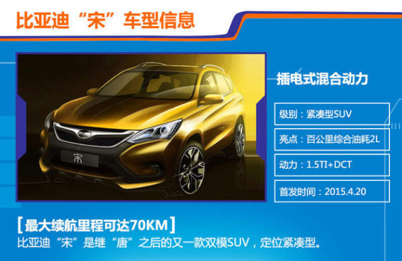 “宋”是比亚迪“542”战略的第二款车型,与比亚迪“唐”不同,该车主打都市紧凑SUV市场。由于目前市面上还没有其他使用插电式混合动力系统的车型,所以待比亚迪“宋”上市后,并没有直接的竞争对手。因此,“宋”的推出更多体现的是比亚迪对新能源市场的战略布局,丰富自己的产品线,并且对外展示自己多年来潜心修炼的先进技术和造车实力。