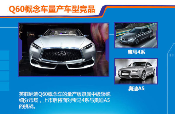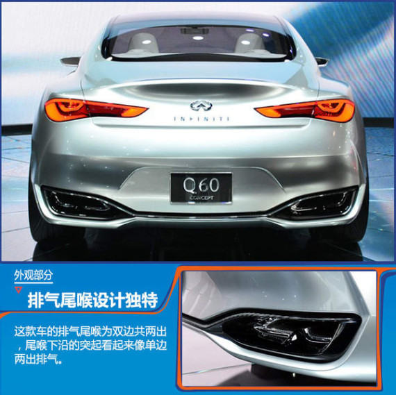 在上海国际车展前夜英菲尼迪提前举办一场名为“设计之夜”的盛大活动,活动现场英菲尼迪在亚洲首次发布亮相了一款Q60概念轿跑车。英菲尼迪官方透露:此次亮相的Q60概念车规划明年实现量产,后续推向全球市场。这款车与家族旗下的四门轿车Q50基于同平台打造,可以看做是Q50的双门轿跑版,量产车型上市后将直接竞争宝马4系。