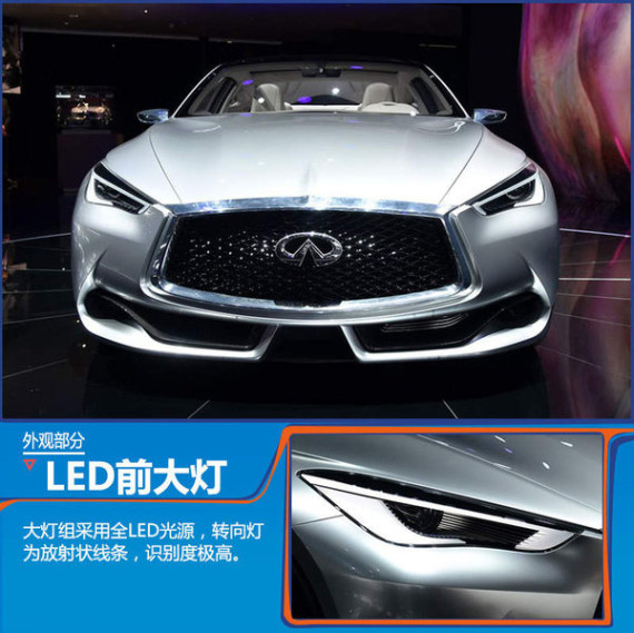 从Q60概念车的前脸可以看到目前英菲尼迪的家族式设计元素,大尺寸的进气格栅搭配运动风格的蜂窝状中网,前发动机盖上的隆起、线条为前脸增添不少力量感。全LED前大灯的灯眉与左侧是日间行车灯,LED灯带造型很是犀利。灯组的转向灯设计成放射状线条,拥有很高的识别度。前保险杠两侧是大尺寸的进气口,其内部带有导流设计。
