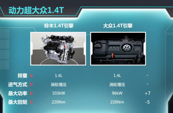 铃木最新的1.4T涡轮增压发动机动力表现卓越,最大功率103kW,最大扭矩220Nm,通过与大众速腾搭载的大众1.4T涡轮增压发动机进行动力对比可以发现,铃木小排量增压发动机最大扭矩与后者持平,但最大功率优于后者。