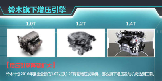 当下小排量增压发动机已经成为一种趋势,铃木也在这方面做了很多努力,并且曾发表计划称在2016年推出全新的1.0T以及1.2T涡轮增压发动机(目前这两款发动机已经处于研发阶段),这样铃木旗下涡轮增压发动机产品序列将会得到进一步完善。