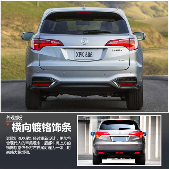 新车侧身改动较小,只是轮毂经过重新设计,使得新车运动感得到增强。凸显时尚感的镀铬饰条,依然固定于车窗周围,与现款车型保持一致。新RDX尾部造型同样改动较小,整体造型依然层次清晰,但重新设计的L形尾灯组凸显其时尚气息,在横向镀铬饰条的修饰下左右尾灯连为一体,增添了许多美感。