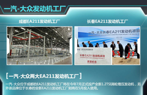 全新1.2TSI发动机未来有望在成都和长春两座EA211发动机工厂进行投产,成都作为一汽-大众首座EA211发动机生产基地,于2013年正式投产,年产能为45万台,目前已进入1.2TSI发动机的试生产阶段。关于该工厂对于新引擎的产品规划,一汽-大众内部知情人士向网通社表示:全新的1.2TSI发动机在7月份将正式投入生产,到年底预计将生产几千台,而在明年将逐步增加该款发动机的产量。另据了解,长春发动机工厂将在今年5月投入生产,届时将与成都工厂一同为一汽-大众旗下产品提供动力系统。