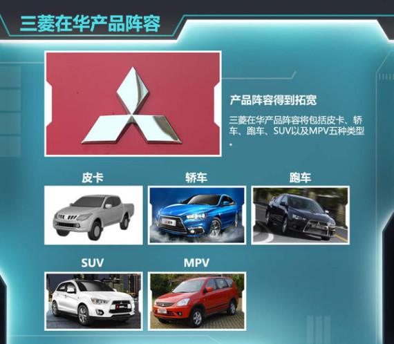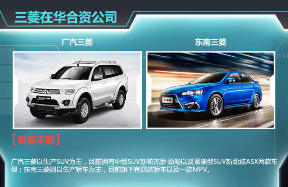三菱汽车在华分别与广汽集团以及东南汽车合资成立广汽三菱和东南三菱两家合资公司,广汽三菱侧重于SUV车型,目前旗下有中型SUV新帕杰罗·劲畅以及紧凑型SUV新劲炫ASX两款车型;而东南三菱则侧重于轿车,目前旗下有风迪思、蓝瑟、翼神和戈蓝四款轿车以及一款MPV车型君阁。这两家合资公司分别在不同的细分市场为三菱汽车在华销量的稳步增长做出努力。