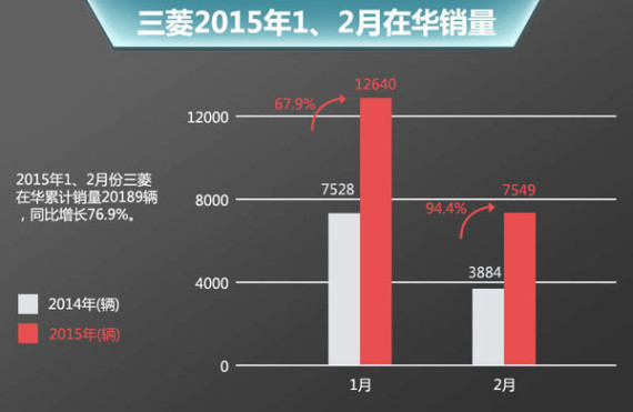 2015年2月份三菱汽车在中国市场(含进口车)累计销量为7,549辆,较之2014年2月的3,884辆,同比增长94.4%。综合1月和2月,三菱今年累计在华销量从11,412辆同比增长76.9%至20,189辆。三菱汽车2015年在华取得了良好的开局,相信随着第五代L200等车型的导入,三菱汽车在华销量将更上一层楼。