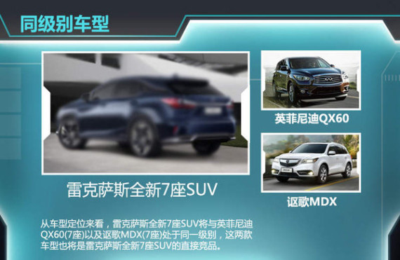 根据雷克萨斯全新7座SUV的定位来看,该车与同为日系豪华品牌的英菲尼迪QX60以及讴歌MDX处于同一级别,两车均采用的是3.5L自然吸气发动机,而雷克萨斯全新7座SUV在动力上有望采用丰田最新的2.0T涡轮增压引擎,并且也有望提供混动版本,未来该车上市后竞争对手将直接锁定为这两款车型。