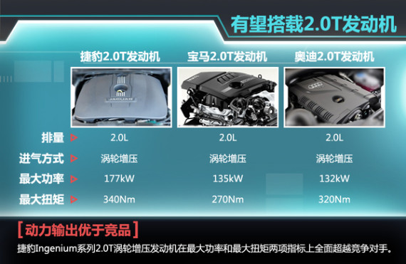 目前捷豹Ingenium系列2.0T涡轮增压发动机已经在XE等车型上搭载,这款增压发动机动力输出强劲,最大功率177kW,最大扭矩则达到了340Nm,通过与宝马2.0T以及奥迪2.0T增压发动机对比可以发现,捷豹这款增压发动机优势明显,在最大功率和最大扭矩两方面全面超越竞争对手。鉴于F-PACE主打运动风格,需要强劲的动力输出,因此该车有望与XE共享这款2.0T涡轮增压发动机。
