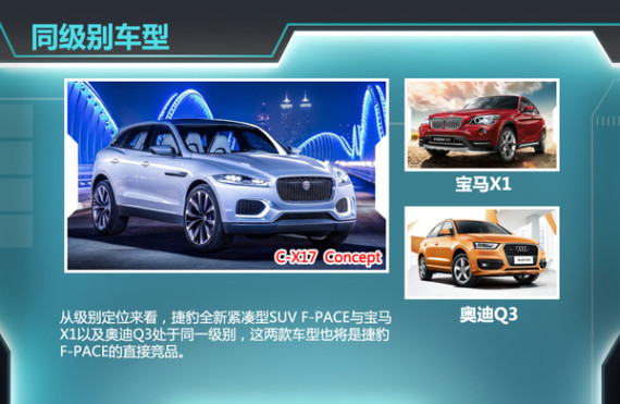 捷豹C-X17概念车于2013年在法兰克福车展正式发布,而此前捷豹将基于C-X17打造的跑车型运动多功能车正式命名为捷豹F-PACE,主打运动风格。捷豹F-PACE的设计灵感源自F-TYPE,融合跑车外观设计的同时也有宽敞的驾乘空间,因此F-PACE既能满足消费者对跑车的视觉追求,同时也能平衡他们对于实用性的需要。