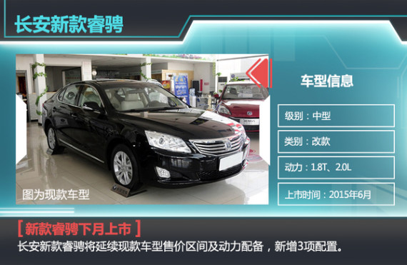 睿骋是长安自主品牌旗下首款中型轿车,现款车型于2013年正式上市,是长安轿车产品阵容中的旗舰车型。此前长安睿骋共推出7款不同配置的车型,售价区间为10.98万-17.08万元。近日从长安内部人士获悉,2015款睿骋有望于今年6月正式上市,并将在延续现款车型售价区间的基础上,增加新配置。