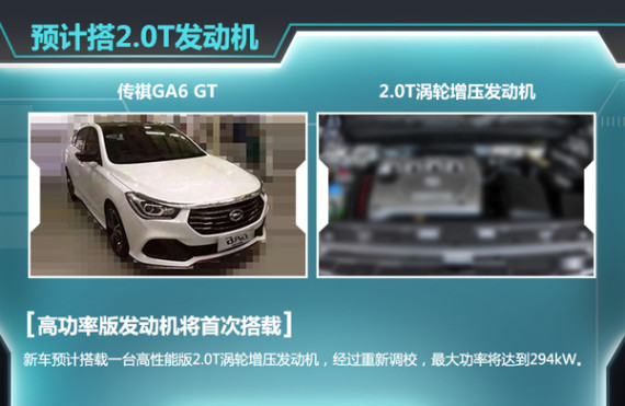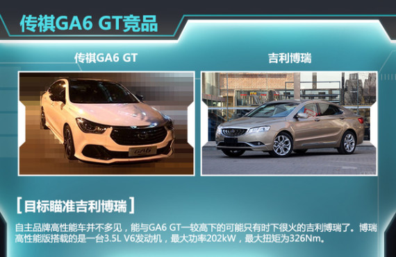 作为一款高性能车,GA6 GT并不是徒有其表。新车有望搭载一台2.0T涡轮增压发动机,经过重新调校后,最大功率达294kW。自主品牌高性能车并不多见,GA6 GT在自主品牌中还没有能够直接竞争的车型。放眼望去可能只有时下很火的吉利博瑞能与其一较高下。博瑞高性能版搭载的是一台3.5L V6发动机,最大功率202kW,最大扭矩为326Nm。虽然具体的动力参数还不能确定,但从此次曝光的最大功率上看,传祺GA6 GT的动力表现非常值得期待。