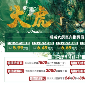斯威大虎上市,有望搅动6万级硬派大七座SUV细分领域,同时也进一步提升品牌核心竞争力。目前,斯威大虎还推出了首批车主五大抢定权益,助力用户轻松购车、省心用车,带给消费者高性价比体验。