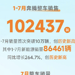 刚刚,一汽奔腾发布7月销量,1-7月奔腾整车销售102437辆,1-7月销量首次突破10万辆创历史新高,一汽奔腾悦意双子星万台交车。