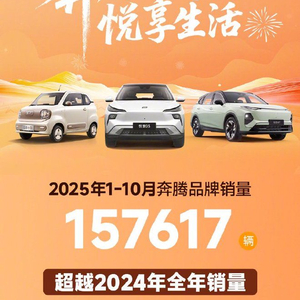 日前,一汽奔腾公布了最新销量数据。2025年1-10月奔腾品牌销量157617辆,同比增长35.2%;其中新能源1-10月销量135671辆,同比增长139.8%,超越2024年全年销量,
