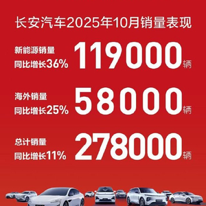 长安汽车2025年10月新能源销量119000辆,同比增长36%;海外销量58000辆,同比增长25%;总计销量278000辆,同比增长11%。