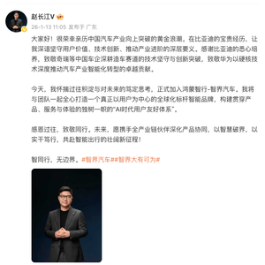 日前,赵长江官宣加入智界汽车,任职智界汽车执行董事及执行副总裁。此前在比亚迪任职长达16年,并在2021年担任腾势销售事业部总经理兼首席共创官,2025年7月转任腾势方程豹直营事业部总经理,并于2025年10月24日正式宣布离职比亚迪。