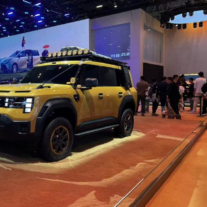 车身侧面较为方正,外抛式宽体轮眉+AT专业越野轮胎,搭配齐平式机械门把手与侧踏板,兼顾野性与实用;车顶搭载激光雷达+行李架,翼子板嵌入传感器,预埋高阶智能驾驶能力;展车配备“车顶小书包”与外挂装备,改装风格浓郁。