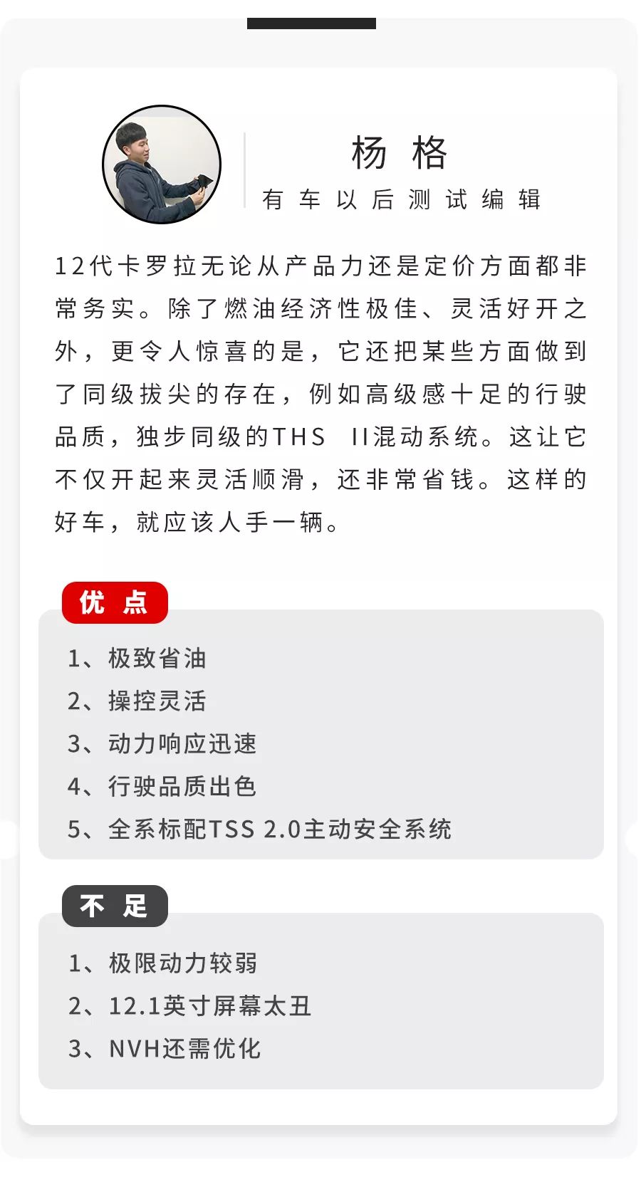 12代卡罗拉虽然也有很多不足,例如大屏太丑、后排不够铺张、隔音一般般。但TNGA的GA-C平台也赋予了它高级的行驶质感,配合同级别技术含量最高的混动系统,让它在家用车追求的经济性和平顺性方面做到了极致,驾控灵活顺滑,还大大减少了跑油站的频率。这样的好车,就应该人手一辆。