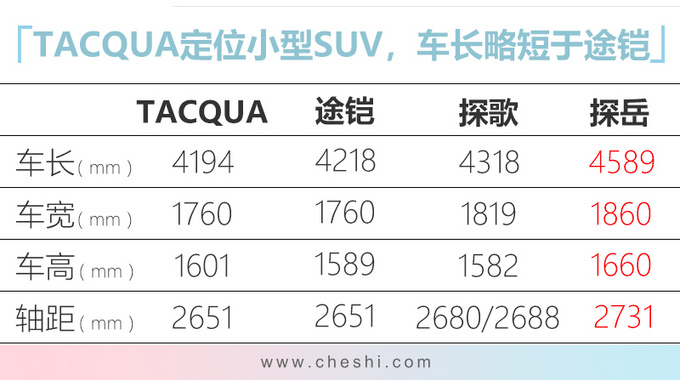 TACQUA定位低于探歌、探岳,生产平台为MQB A0,不过车身长度略短于同平台的上汽大众途铠T-Cross,但两车轴距数据保持一致。相比XR-V、缤智、ix25、吉利缤越等竞品,新车整体尺寸略小一些,不过轴距数据明显占优,这也意味的其内部空间更加充裕。
