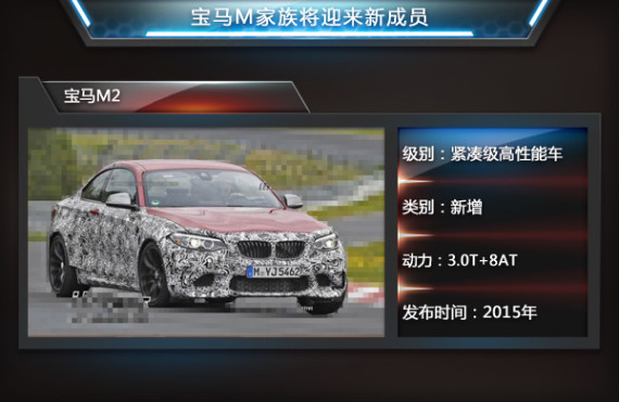 随着范·米尔的加入,宝马M品牌也将迎来新的家族成员。近日网通社从欧洲汽车媒体worldcarfans了解到,宝马将基于2系推出入门高性能车型——M2。动力方面,全新宝马M2有望搭载一款3.0T涡轮增压发动机,最大功率279kW,相比目前M235i所采用最大功率235kW的同排量引擎而言,高出了44kW。此外,新车有望在2015年正式发布亮相。(网通社 2014年9月30日 北京报道)