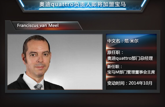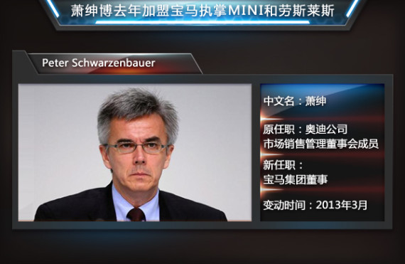 去年3月14日,宝马集团宣布前奥迪营销总监萧绅博(Peter Schwarzenbauer)进入其管理委员会,负责MINI、劳斯莱斯、宝马摩托和集团售后业务。接替哈拉尔·克鲁格(Harald Krueger)的职务。在一年半后,宝马集团宣布前奥迪旗下quattro部门总经理范·米尔(Franciscus van Meel)将任职宝马M部门管理董事会主席,接替年底退休的Friedrich Nitschke。