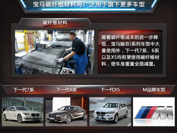 在刚刚上市的i3与i8车型中,碳纤维首次成为车身架构的主要材料,因此碳纤维材料使用量将上升,如何降低该材料成本,已成为放在宝马面前的问题。伴随着碳纤维成本的降低,加之工厂材料产能的全面提升,宝马有望在i系列之外的车型中大量使用碳纤维,下一代7系、6系以及X5均有绝使用该材料,使车身重量全面减重,进而提高车辆整体性能。