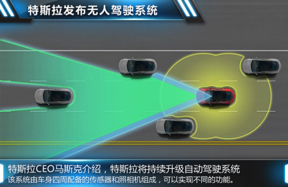 与新车一同发布的还有特斯拉的无人驾驶系统,或者目前我们更应该称其为特斯拉的安全辅助驾驶系统。该系统由车身四周配备的传感器和照相机组成,可以实现不同的功能,率先实现车道偏离警告和超速提醒。根据特斯拉CEO马斯克介绍,接下来的几个月内,特斯拉将持续升级自动驾驶系统,车主可以通过软件更新不断地升级自动驾驶功能。