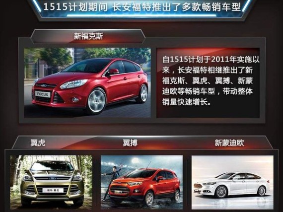据最新数据统计,今年1-10月长安福特的累计销量为66万辆,与第一阵营中南北大众百万辆级相比尚有差距。而长安福特在新规划中制定略显超前的目标,与之前1515计划的成功实施不无关系。自1515计划于2011年实施以来,长安福特相继推出了新福克斯、翼虎、翼搏、新蒙迪欧等畅销车型,带动整体销量快速增长。