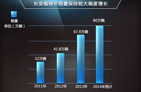长安福特2012年销量达41.8万辆,较2011年32万辆的销量显著提高31%。2013年,长安福特销量为67.9万辆,同比增长62%。2014年,在没有新车型投放的情况下,长安福特前10个月的销量超过66万辆,同比增长23%,是汽车行业6.6%平均增幅的三倍多。按照年初预期,长安福特今年的销量目标是冲击80万辆,目前看来难度不大。