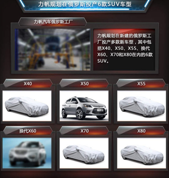 由于在未来几年中力帆会去重点完善旗下SUV产品结构,并力争在各个细分市场均有所突破,一系列新车型也得以孕育而生。几乎可以肯定的是,未来力帆汽车将会在俄罗斯的新整车工厂完成X40、X50、X55、换代X60、X70以及X80这六款SUV的投放工作。