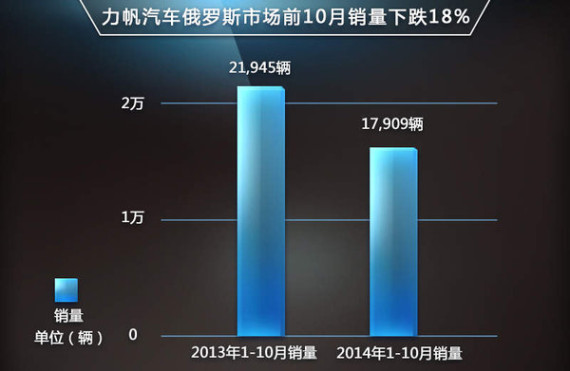 受困于俄罗斯汽车市场的整体低迷,力帆汽车今年在俄罗斯的销量发生了下滑。根据力帆汽车最新公布的数据显示,今年1-10月,力帆汽车累计在俄罗斯销售17,909辆汽车,这一数字比去年同期的21,945辆,下跌了18.4%。面对不佳的市场表现,力帆除了将继续加大新车型的投放力度外,增资建设新工厂也成为企业用来提振销量的有效途径之一。