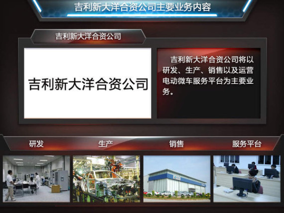 吉利新大洋公司将以研发、生产、销售以及运营电动微车服务平台为主要业务。公司的管理总部、销售总公司、纯电动汽车研发中心、城市微行电动汽车租赁公司以及年产30万台的生产基地全部将设在宁海,在以城市微型纯电动车为主要产品的基础上,继续研发更高技术含量的产品。