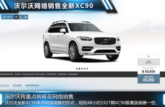 面对竞争日益激烈的汽车市场,各大车企均在寻求突破点,以求进一步拉升销量的增长。沃尔沃在今年发布了全新一代XC90发布,该车便采用网上销售的形式,短短48小时1927辆全新XC90限量版便销售一空,这也为沃尔沃开发电子商务领域的竞争打下基础。沃尔沃汽车集团市场营销、销售及客户服务高级副总裁艾伦。维瑟先生表示:“在当前的全球商业领域中,汽车行业的营销方式相对保守、缺少革新,长期以来,汽车营销一直遵循着全行业通行的模式。如今,沃尔沃汽车集团决定突破常规,从沃尔沃自身需要出发,启用全新营销战略,彰显其独特的品牌价值。”