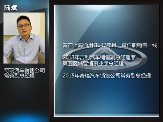 自主品牌奇瑞最近也有新成员加入。原吉利汽车销售副总经理兼第五区域营销事业部总经理陆斌已确认加盟奇瑞,出任营销公司常务副总经理。陆斌此次加盟奇瑞其实有迹可循。去年年底原吉利汽车副总裁孙晓东确认加盟奇瑞,而陆斌与孙晓东此前在上海通用共事7年到,之后先后加盟奇瑞,此次跳槽奇瑞也在情理之中。