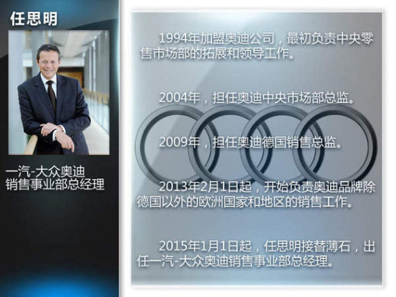 年初,一汽-大众奥迪也迎来人事调整。2015年1月1日起,任思明(Michael-Julius Renz)接替薄石担任一汽-大众奥迪销售事业部总经理一职。作为新任总经理的任思明将与执行副总经理葛树文一起,负责奥迪品牌国产车及进口车在中国的营销工作。