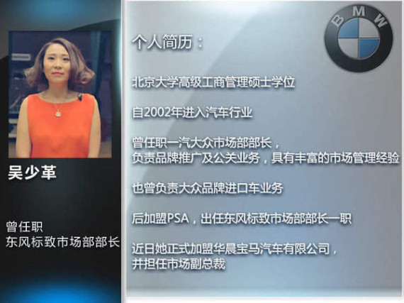 吴少革女士毕业于北京大学,获高级工商管理硕士学位,并至今已有超过20年的工作经验。在2002年正式进入汽车行业,曾任职一汽大众市场部部长,负责品牌推广及公关业务,具有丰富的市场管理经验。随后加盟PSA后,出任东风标致市场部部长一职,见证了近几年该品牌在华的快速成长。在加盟华晨宝马后,吴少革将带领这个已在国内有着良好口碑的豪华品牌,往更高处迈进。