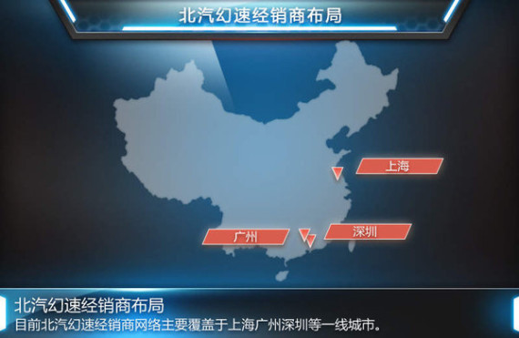 目前北汽幻速经销商网络主要覆盖于上海、广州、深圳等一线城市,现阶段的230家一级经销商网络并不足以覆盖三四线城市。随着北京、上海、天津等一线城市限牌,渠道下沉的已势在必行,,北汽幻速的经销商网络布局已展开,2015年北汽幻速主要针对三四线城市覆盖一级经销商。尽管销售网络已开始向三四线城市下沉,但北汽幻速销售有限公司总经理张军表示:北汽幻速并不会放弃一二线城市。