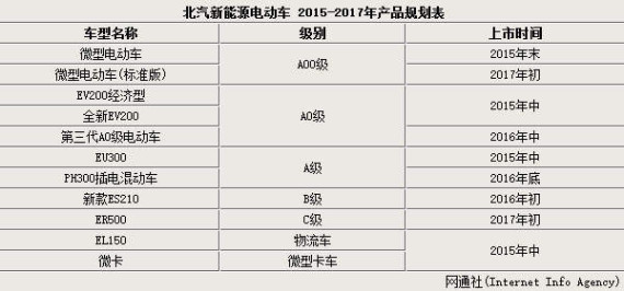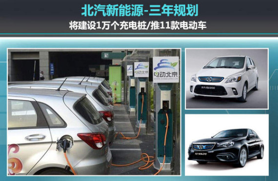全面布局充电网络的同时,北汽新能源在近两年内规划进一步完善电动车的产品阵容,推出11款新车,其中包括两款A00级电动车、三款A0级电动车、两款A级电动车(含首款插电式混合动力车型)、一款B级电动车、一款C级电动车、一款微型卡车以及一款电动物流车;上述新产品的推出,将使北汽新能源在2017年初步形成电动车的家族阵容。