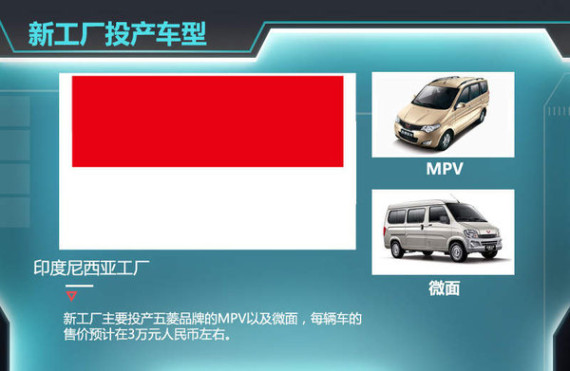 上汽通用五菱新工厂位于印尼的雅加达,项目总投资达到7亿美元。新工厂预计将于今年8月份开工建设,规划年产能150,000辆。预计2017年建成投产能。对于工厂投产的车型,上汽通用五菱官方并未公布。不过据知情人士透露,新工厂的产品主要是五菱品牌MPV/微面,每辆车的售价预计在3万元人民币左右,(约合4,800美元)。