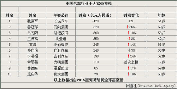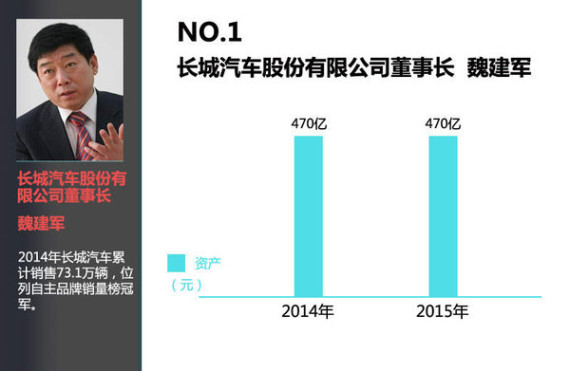 2014年,我国汽车产销分别为2372.29和2349.19万辆,同比增长7.26%和6.86%。其中乘用车增幅较大,同比增长10.15%和9.89%。虽然汽车行业增速较前几年有所放缓,但国内汽车、零部件制造商以及经销商们还是赚的盆满钵满。近日,网通社盘点了汽车圈身价排行前十的富豪,他们总资产再次刷新纪录,累计超2500亿元人民币。排在第一的依旧是去年的冠军——长城汽车股份有限公司董事长魏建军,总资产为470亿元人民币。万向集团董事局主席鲁冠球资产增幅最快,一年时间增长了36%,排在第二的位置。
