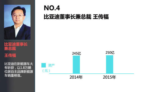 2015年,比亚迪董事长兼总裁王传福以250亿元的总资产屈居第四,他也是汽车界十大富豪中最年轻的一位,今年48岁。
