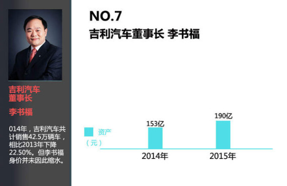 排在第七位的是吉利汽车董事长李书福,现年52岁的李书福,拥有190亿元身家,相比2014年增长了24%。与李书福的资产飘红不同,吉利汽车去年销量继续下滑。2014年,吉利汽车共计销售42.5万辆车,相比2013年下降22.50%。是五大自主品牌中同比降幅最大的车企。日前,网通社从吉利控股集团获悉:吉利携手新大洋机电集团正式成立了合资公司——新大洋电动车科技有限公司。与此同时,该合资公司成立后的首款车型知豆D1电动汽车也已于今日完成工厂下线。未来吉利将加速新能源车的布局。传统汽车方面:吉利今年还将推出旗舰轿车博瑞GC9、帝豪CROSS以及全新SUV等4款新车。如何让吉利汽车止跌反弹,相信这是李书福现阶段要面对的一大难题。