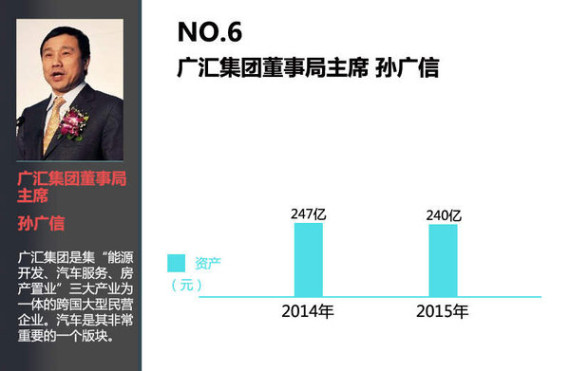 排名第六的广汇集团董事局主席孙广信现年53岁,总资产240亿元,相比上一年小幅缩水了3%,这也是排行前十的富豪中唯一身家缩水的一位。不过目前他还是汽车销售商中总资产第一人。广汇集团是集“能源开发、汽车服务、房产置业”三大产业为一体的跨国大型民营企业。2014年,广汇集团将成为中国综合经济实力排名前50位的大型企业集团,进入世界500强。截至2014年底,集团经营收入1032.56亿元,净利润53.5亿元。