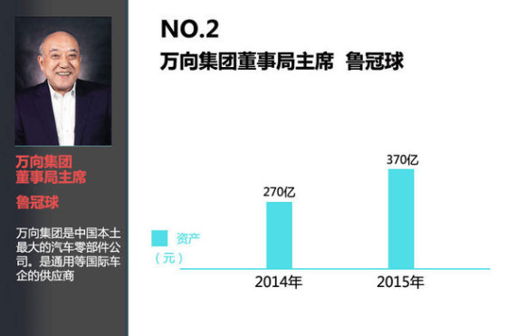 排在第二位置的是万向集团董事局主席鲁冠球。目前已有370亿元身价。鲁冠球,1945年出生于浙江省杭州市。1969年创办萧山宁围农机厂,把当时的一个生产农业机械的小作坊,发展成为了中国第一个为美国通用汽车公司提供零部件的OEM。作为中国本土最大的零部件公司的董事局主席,鲁冠球还有一个造车梦。1999年鲁冠球正式立项开发电动车,但一度被一纸批文挡在“整车制造商”的大门外。“我这一代造不了汽车,我儿子也要造!”鲁冠球曾这样对媒体表示。