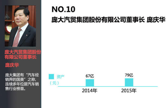 庞庆华,现任庞大汽贸集团股份有限公司董事长。今年他以79亿元的资产挤进前十名,相比上一年增长了18%。庞庆华领导的庞大汽贸连续多年位居汽车销售行业榜首,竞购萨博汽车令庞庆华与庞大汽贸名声大振。庞庆华从代理卡车、轻卡和农用车开始进入汽车流通市场,2002年庞大开始建设轿车4S店,代理捷达品牌。目前庞大产业链包括汽车园区、汽车卖场、4s店等,涉及的品类、品牌众多。在汽车圈,庞大集团有“汽车经销界的国美”之称。