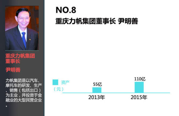 在汽车制造业和营销领域个人资产排名第八的富豪是力帆集团的控股人尹明善。目前伊明善家族的总资产已经达到了110亿,相比2013年翻了一倍,资本累积的速度惊人。力帆股份董事长尹明善及其家族持有重庆力帆集团公司65.68%股份,其本人还持有重庆力帆集团公司第一大股东力帆控股100%股份。时至今日,力帆集团已将自己定位为摩托车和汽车制造企业。