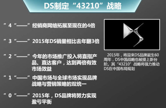 在2014年实现销量快速增长的同时,DS品牌总经理陈国章在2015年推出了“43210”战略,这其中“4”代表着DS品牌旗下经销商网络将拓展至现在的4倍;“3”代表着到2015年年底,DS品牌相比2014年增加三倍的零售销量;“2”代表着DS品牌实现两倍有效市场效益;“1”代表着DS品牌将在中国市场与全球市场实现品牌战略与营销策略的双统一,保证经销商的战略;“0”代表着在2015年,DS品牌将实现盈亏平衡。