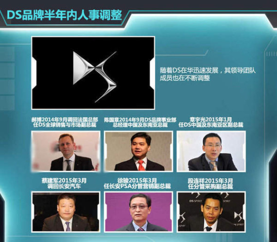 根据长安PSA发布的信息显示,在2014年10月前雷诺中国CEO陈国章接任赫博,正式成为长安标致雪铁龙DS品牌事业部总经理,并兼任DS中国及东南亚总裁一职。随后在今年2月,原标致雪铁龙集团亚洲运营部公共事务及企业传讯总监章宇光,调往长安PSA DS品牌事业部,任职中国及东南亚区副总裁一职,分管市场、传播、品牌管理等工作。