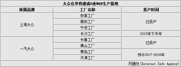 2014年,大众汽车集团各品牌在中国已经建成投产的产能为300万辆,而到2019年前后则将提升至500万辆。这是大众首次确认在华500万辆的年产能目标,为进一步占有中国市场奠定了基础。近日,网通社从大众集团官方获悉:未来大众在华将有8座MQB生产基地陆续投产,年产能较去年将提升超过60%,同时超过40款车型将在华投产。