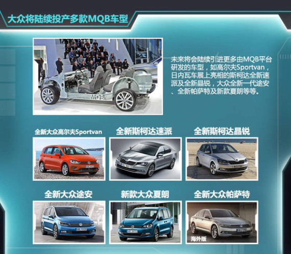 产能提升的同时必须有丰富的产品做支撑,大众集团未来的国产车型均将出自MQB平台。目前国产车型中由MQB平台生产的有上海大众斯柯达明锐、上海大众凌渡、一汽大众七代高尔夫及一汽奥迪A3系列等。未来将会陆续投产更多由MQB平台研发的车型,如全新高尔夫Sportvan,日内瓦车展上亮相的斯柯达全新速派及全新晶锐,大众全新一代途安、全新帕萨特及新款夏朗等等。